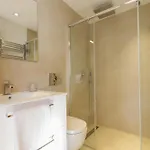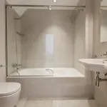 Et badeværelse består af separat toilet, et badekar og en bruser.